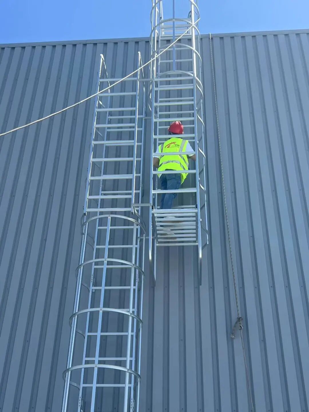 应急逃生场景:单梯段护笼爬梯**高度可达 10 米,可快速衔接建筑物逃生出口,通过护笼防坠落设计与防滑踏棍,确保紧急疏散过程中人员安全,降低混乱场景下的事故风险;
