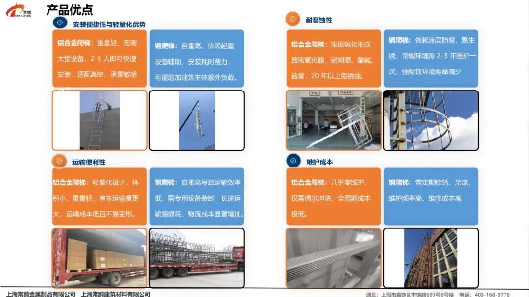 相对于一辆货车装 10 部钢爬梯,铝合金爬梯的模块化、轻量化设计,同样的货车能装 30 部,运输成本直接砍半。配件单独包装,贴好标识,到现场不用分类找件,实际安装效率远超传统钢爬梯,能有效缩短施工周期。